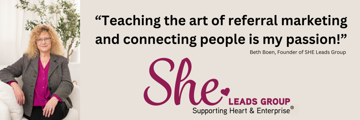 My name is Beth Boen, Founder of SHE Leads Group. I’m a 40-year business development professional and a proud mom to a college-aged son who keeps me on my toes! I have a deep love for helping people build long-term, loyal relationships that lead to quality business connections—relationships that often turn into lifetime customers and endless referrals. SHE Leads Group allows me to live out that passion every day.